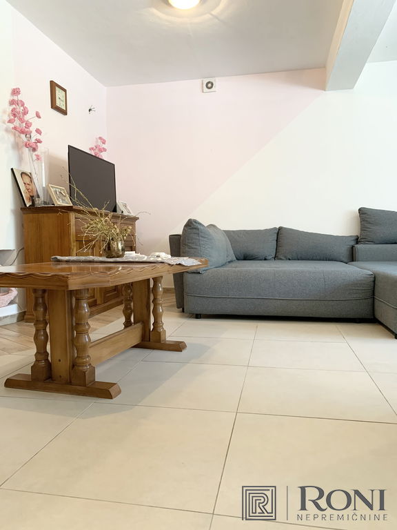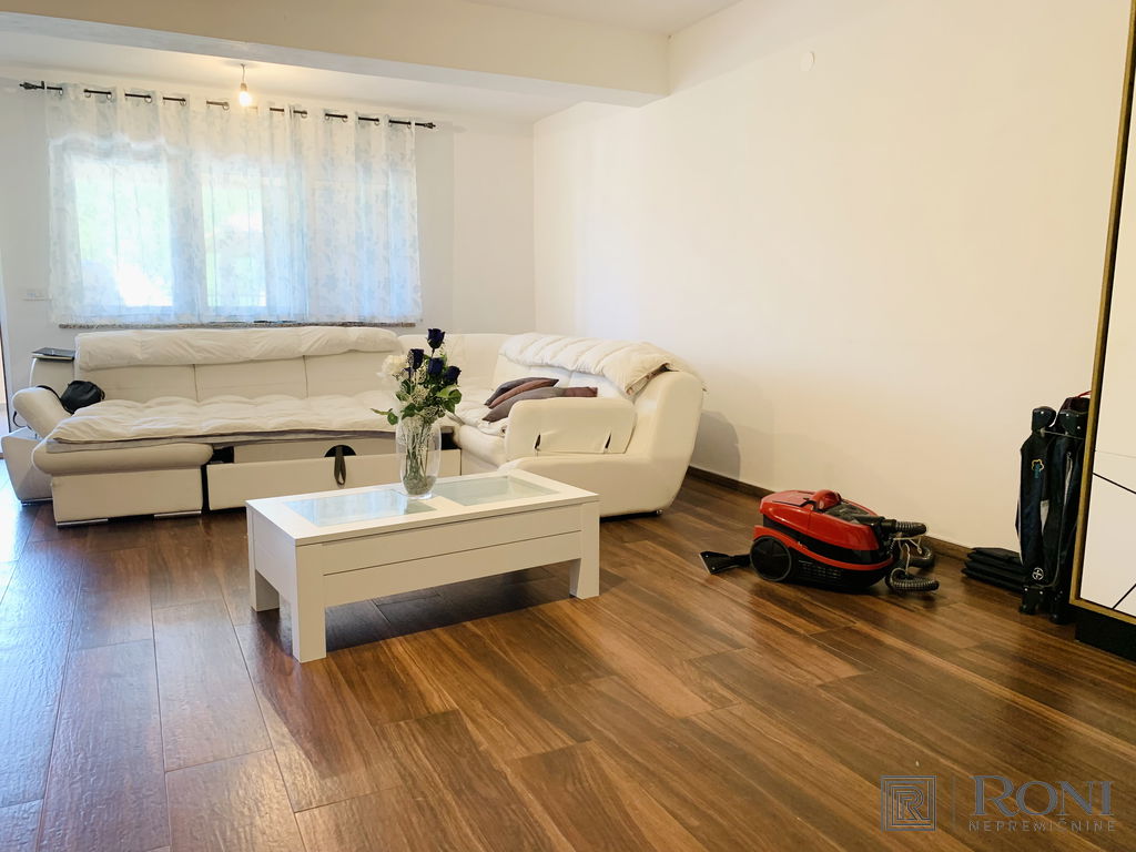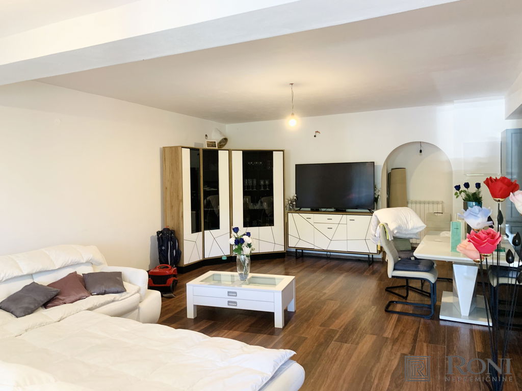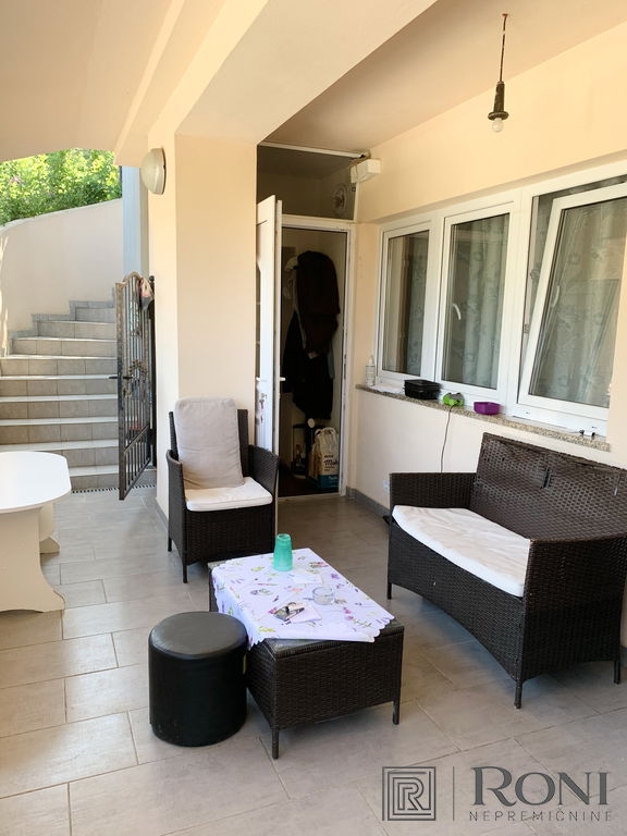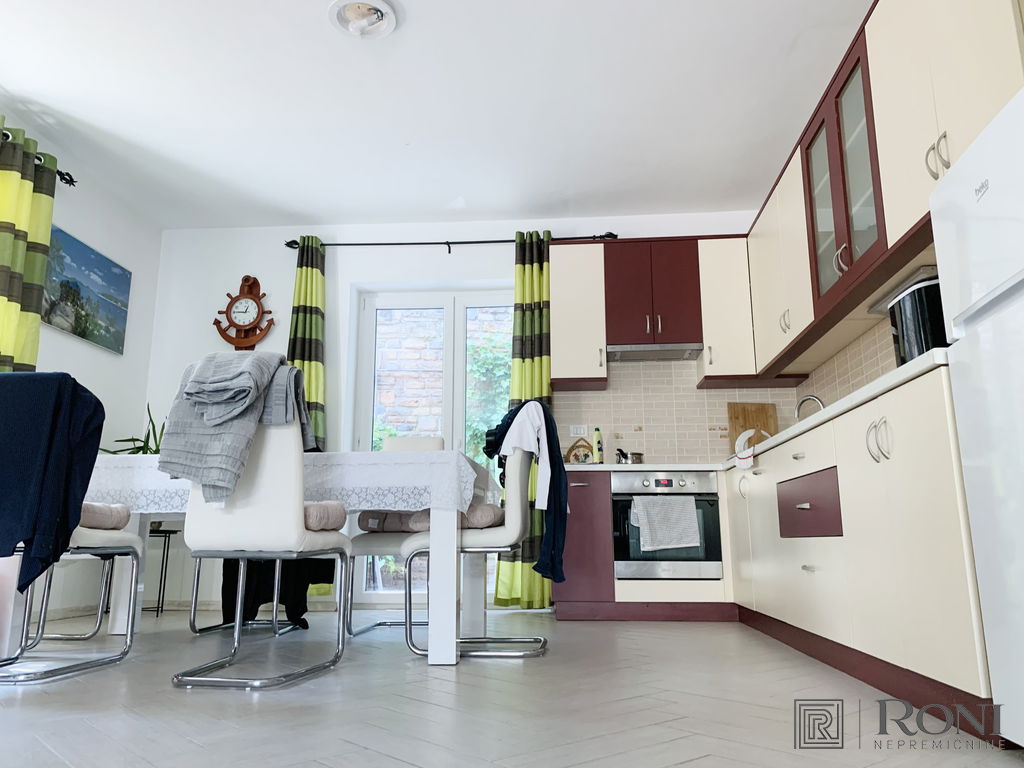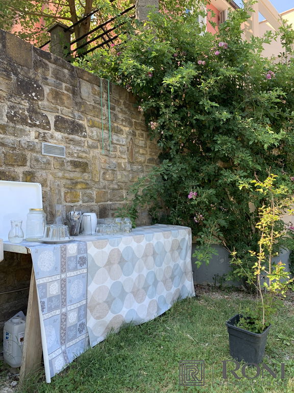 2-room apartment with an extremely large living room and a kitchen with a dining room, which has its own exit to the garden with summer kitchen, and on the other side an exit to the terrace. The apartment has another larger bedroom, a hallway and a bathroom with a bathtub.