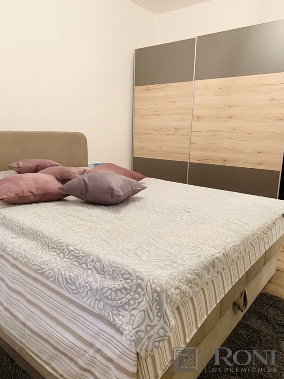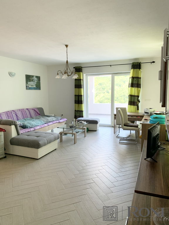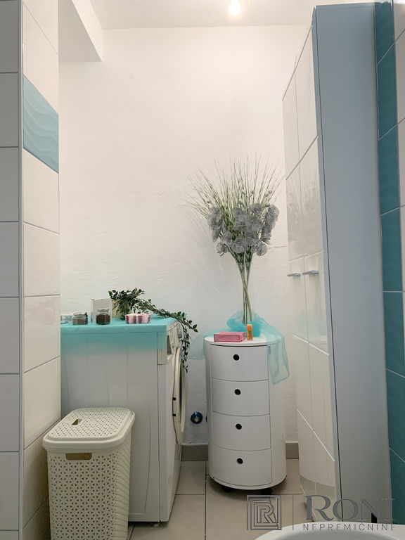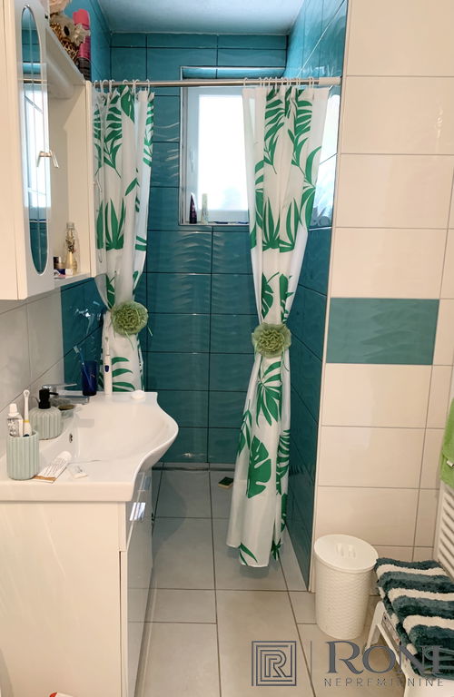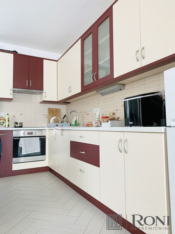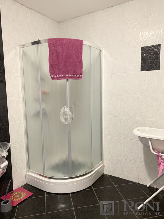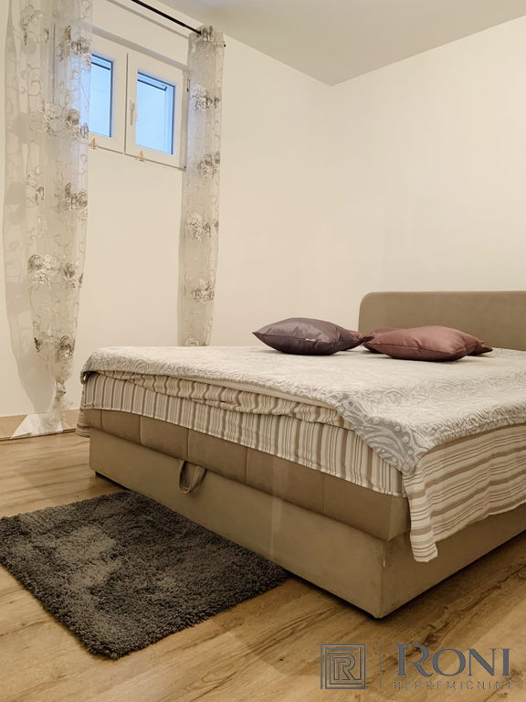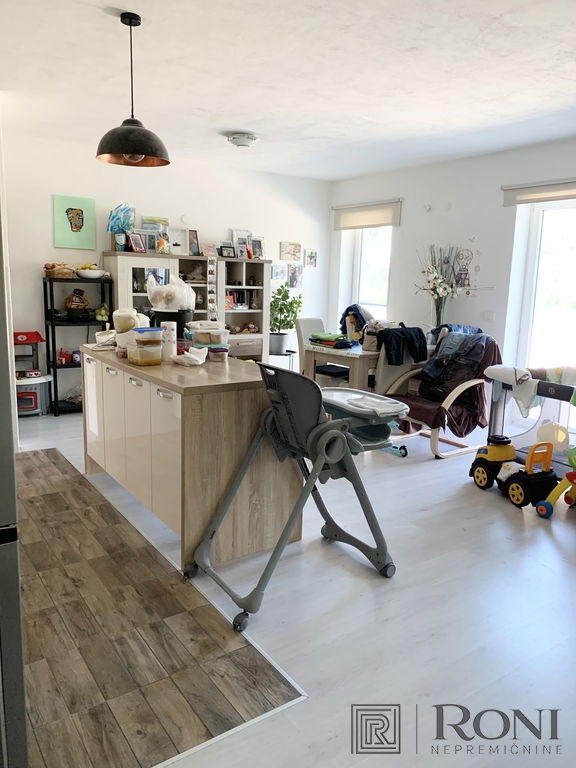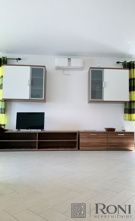 2-room apartment with an extremely large living room and a kitchen with a dining room, which has its own exit to the garden with summer kitchen, and on the other side an exit to the terrace. The apartment has another larger bedroom, a hallway and a bathroom with a bathtub.