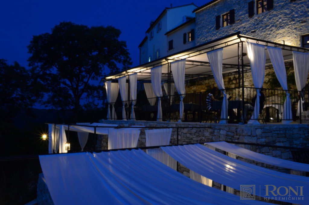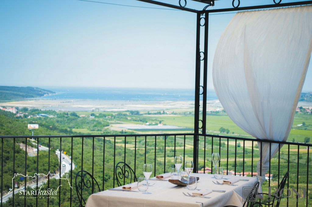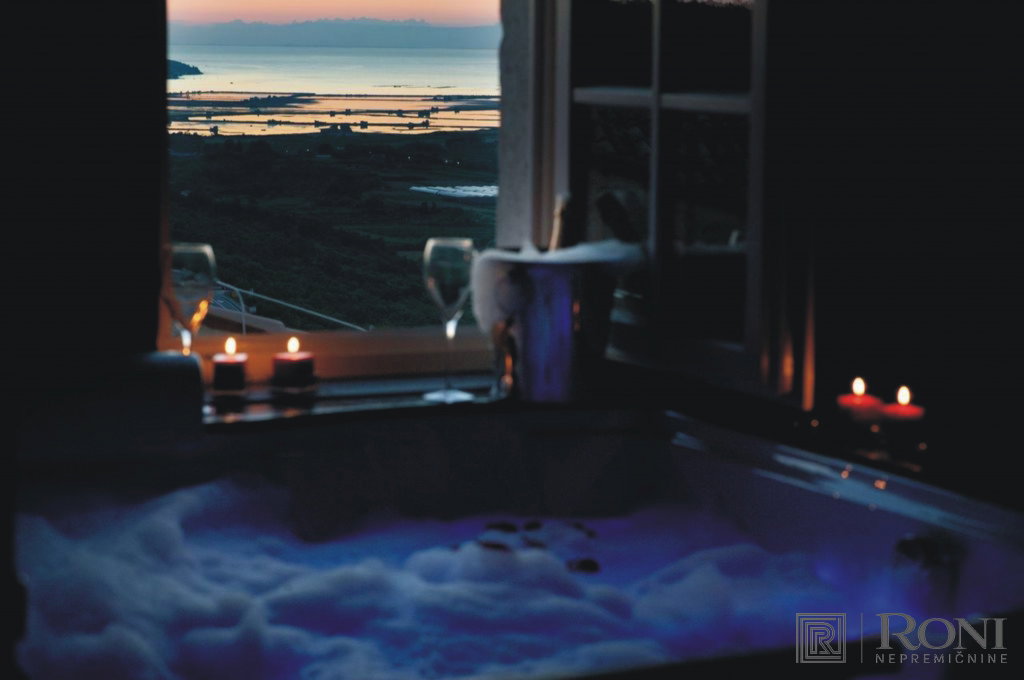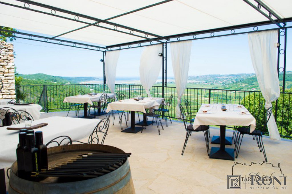 Luxurious villa in a peaceful location in the north-western part of Istria, near the border between Slovenia and Croatia and in the immediate vicinity of the Adriatic sea. At an altitude of 141 meters above the sea level, it is offering stunning views over Sečovlje salt basins and the Piran Bay. Trees surrounding the property contribute to privacy, while a perfect combination of modern design and old heritage make this villa truly unique. The villa is equipped with only high-quality equipment, materials, and furniture. The complex includes: a restaurant, guestrooms, a swimming pool and levelled terraces with a delightful sea view.